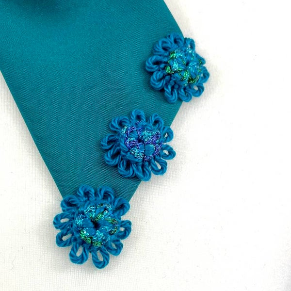 Handgemaakte bloemen met de hand gestikt op de uiteinden van de stof.