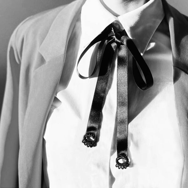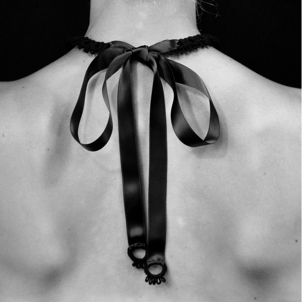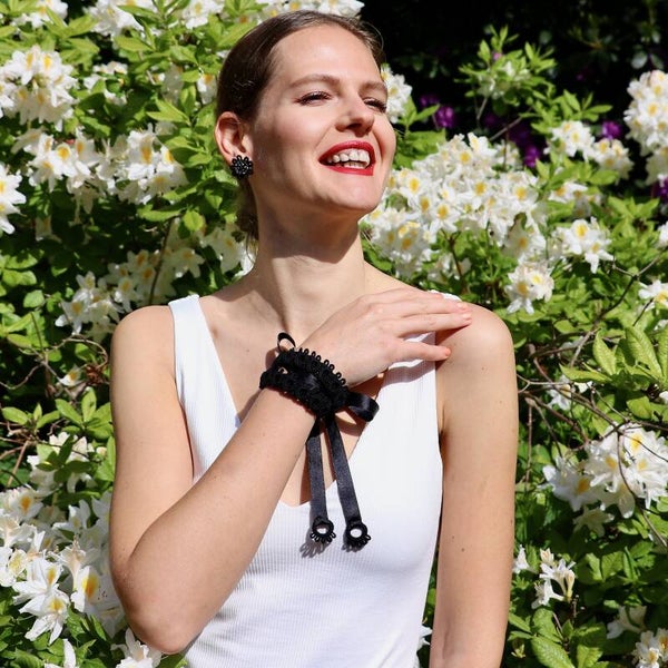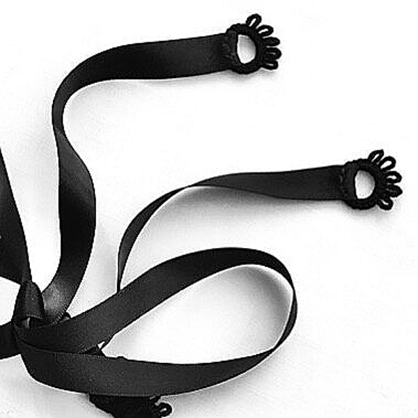 Beautiful black satin ribbon attached to the black 1,5 cm wide handmade lace.