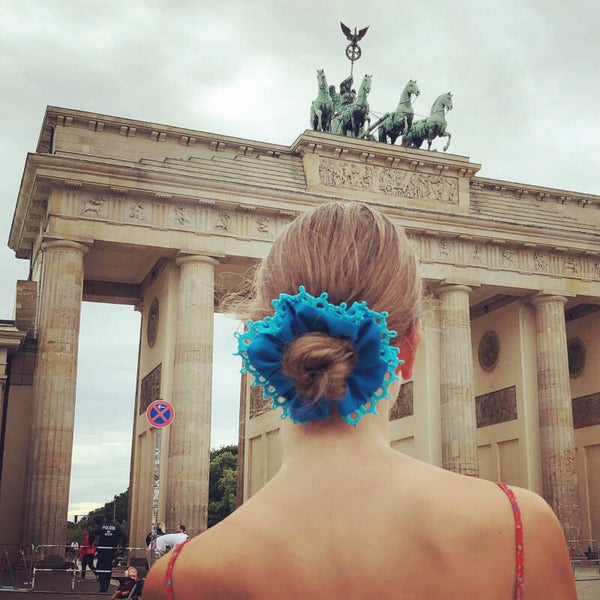 The beautiful turquoise lace is handmade and sewn to the light blue material with elastic inside.
