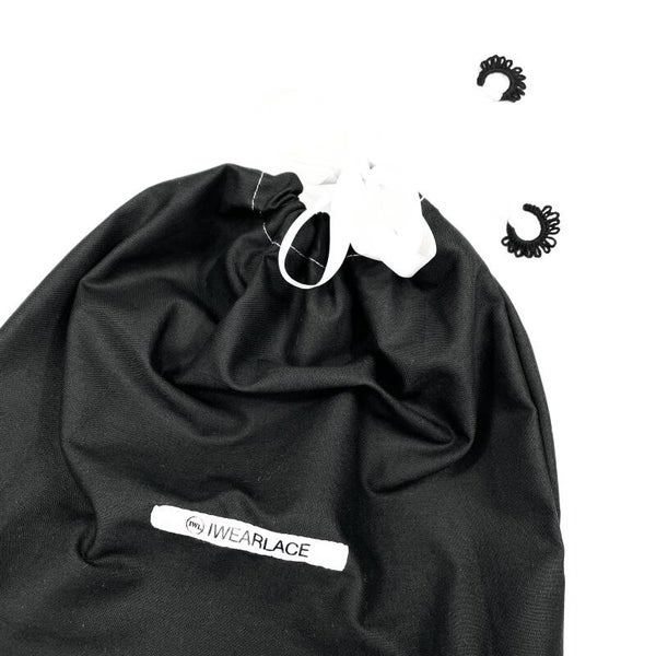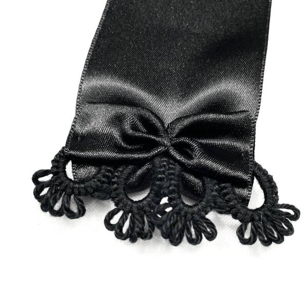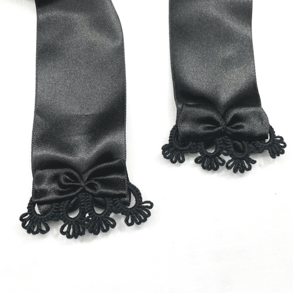 The satin ribbon is handcrafted with elements of handmade black lace.