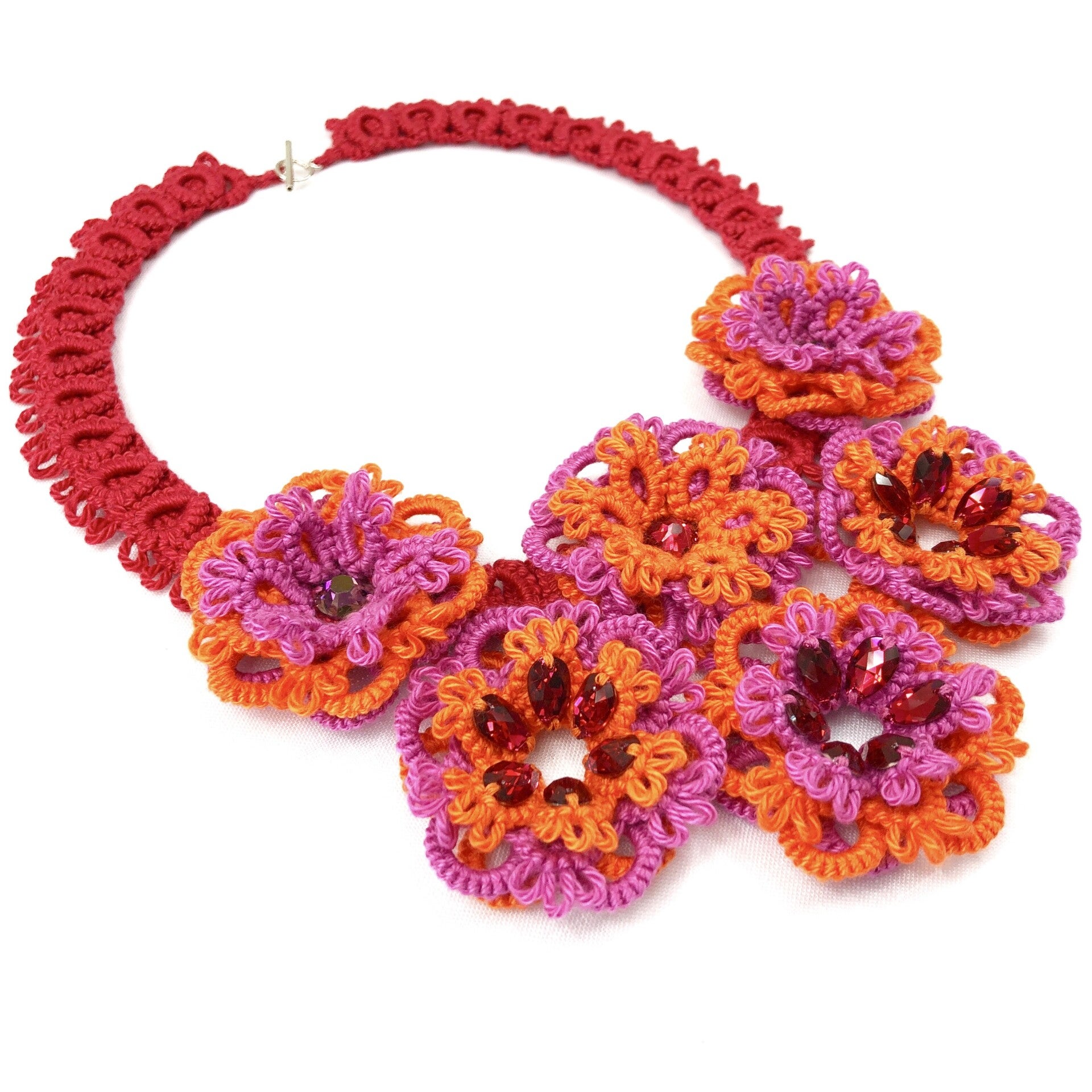 The beautiful lace in red is handmade, folded and handsewn together.