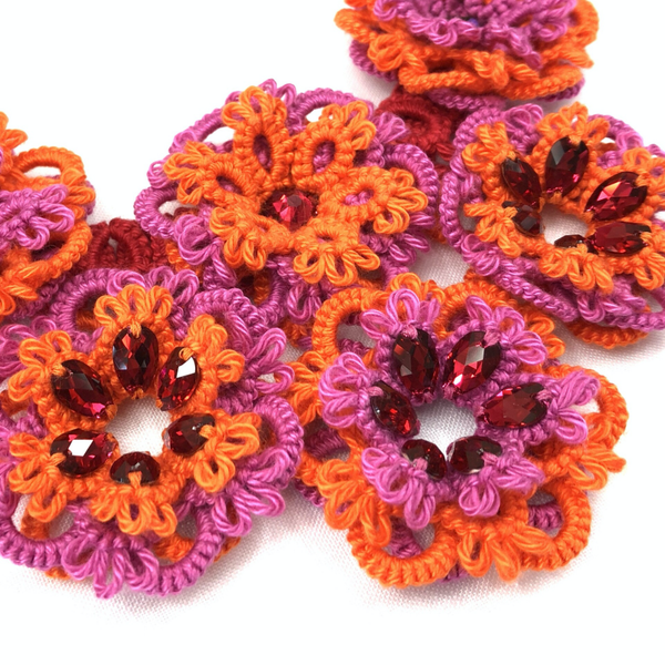 The flowers in orange and pink are made of lace, and genuine Swarovski stones are handsewn onto the flowers.